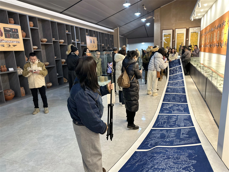 步入彩陶館,駱駝隊(duì)隊(duì)員們被仰韶文化的厚重底蘊(yùn)深深吸引。在公司董事長暨三門峽市仰韶文化非遺傳承人王新軍的引領(lǐng)下,他們凝視著館藏彩陶上那些流轉(zhuǎn)千年的紋樣,手撫仿制陶器,驚嘆于七千年前仰韶先民已經(jīng)掌握礦物顏料繪制、高溫?zé)频木抗に?,也被結(jié)合三門峽特色非遺板藍(lán)根印染技藝的十米仰韶先民生活圖所震撼。